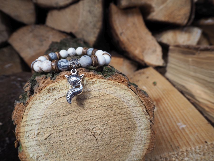 Jemný dámský náramek z přírodních minerálů v harmonické kombinaci magnezitu, šedého jaspisu a dřevěných korálků. Celý design doplňuje přívěsek lišky z bižuterního kovu, který dodává náramku originální a hravý charakter.