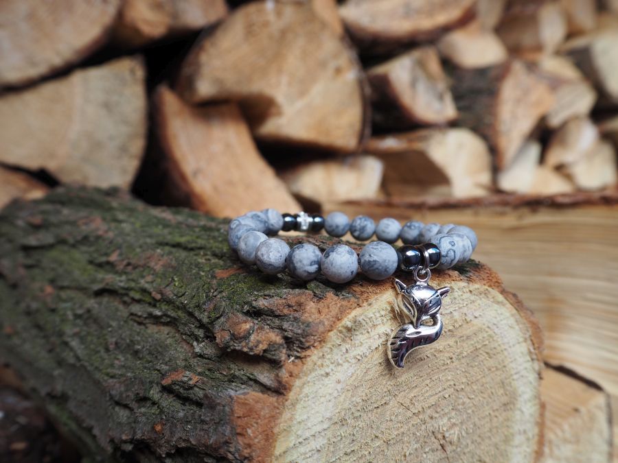 Elegantní dámský náramek z přírodních minerálů doplněný o jemný kovový přívěsek lišky. Kombinace šedého jaspisu a hematitu vytváří harmonický a stylový doplněk, který se hodí pro každodenní nošení i jako originální detail k vašemu outfitu.