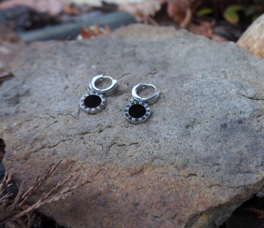 Elegantní ocelové náušnice s motivem ciferníku v nadčasové kombinaci černé a stříbrné. Minimalistický design doplňuje detail římských číslic, který působí jemně luxusně a zároveň moderně.
