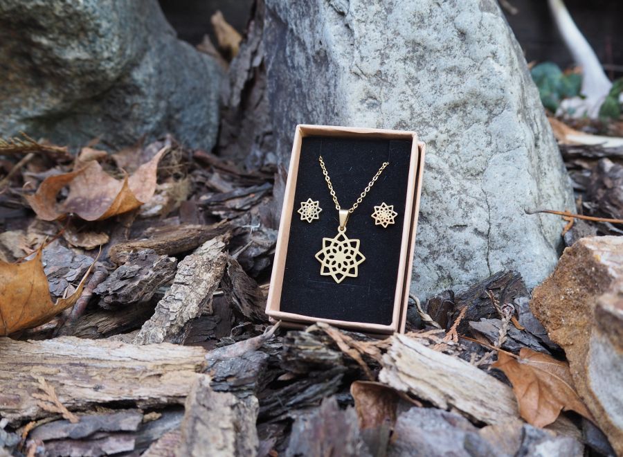 Elegantní set šperků s motivem mandaly, který v sobě spojuje jemnost, symboliku a nadčasový design. Náhrdelník s precizně vyřezávaným přívěskem a ladící náušnice tvoří harmonický celek, který podtrhne váš styl při každé příležitosti.